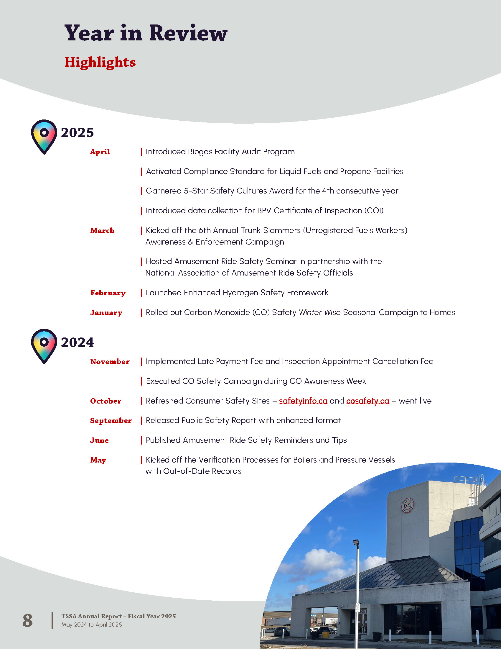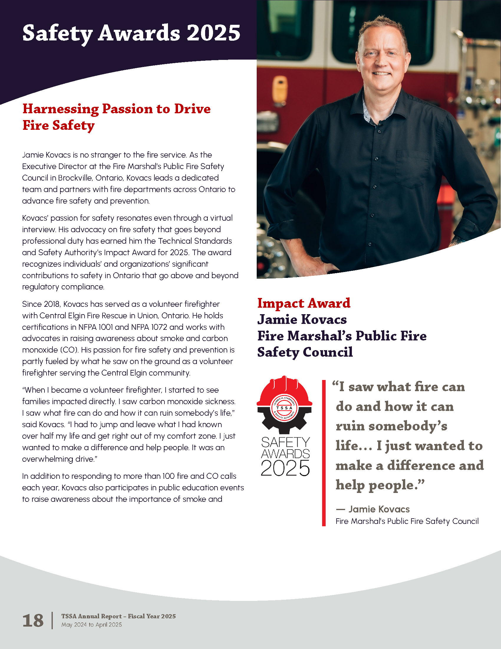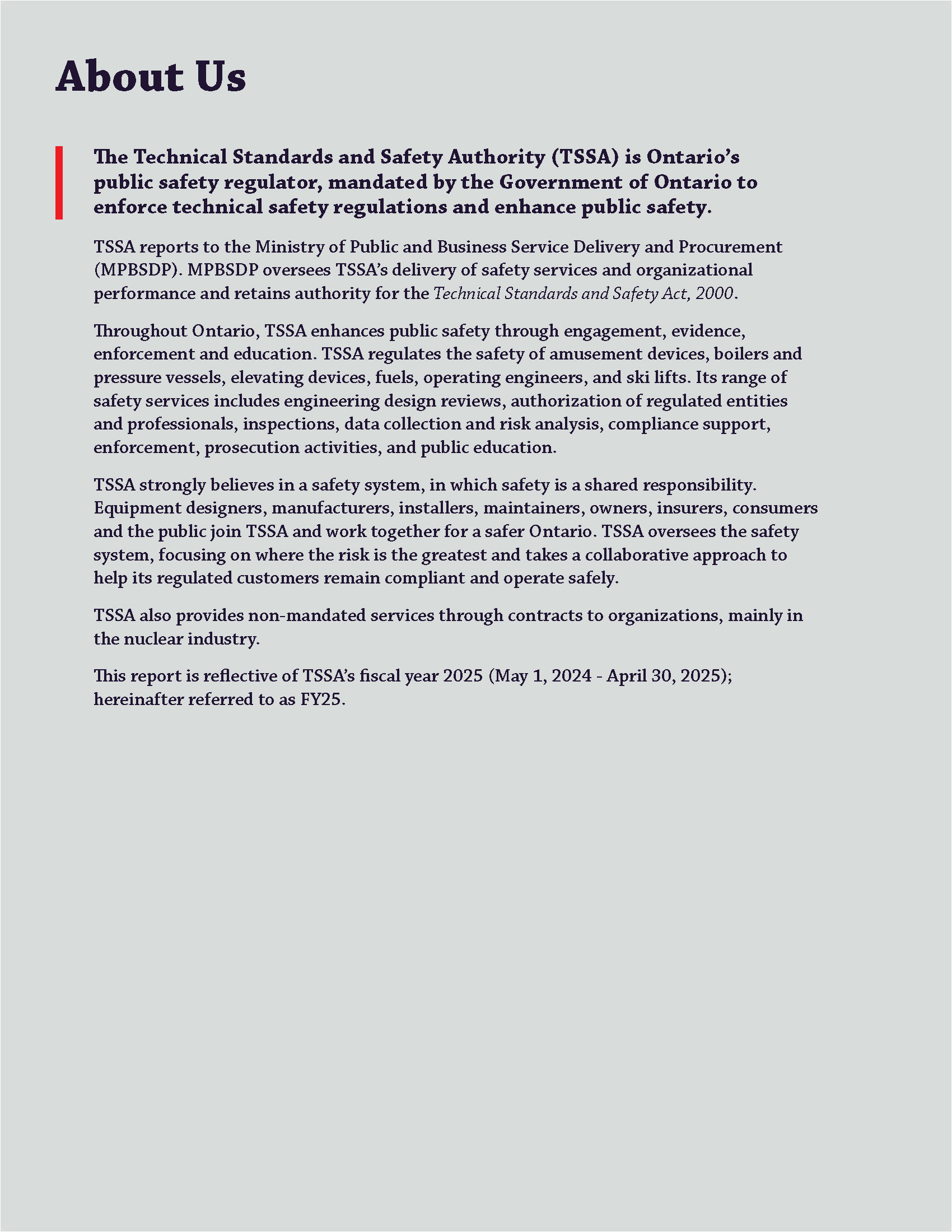 The Annual Report is published by the Technical Standards and Safety Authority in Ontario Canada. The report shares strategy and major achievements from the past fiscal year. It includes messages from leadership, program highlights, accomplishments, financial statements, and corporate policies.