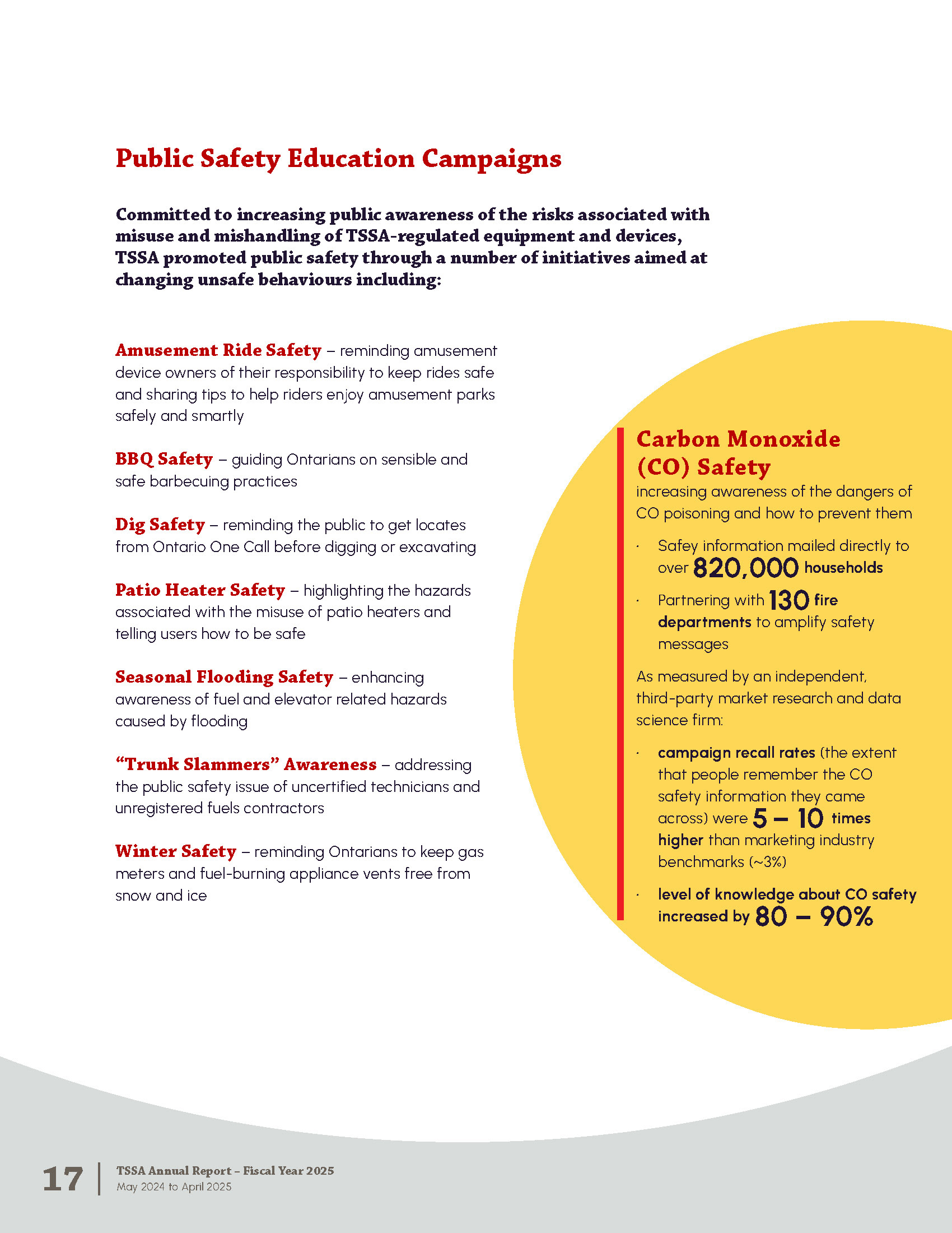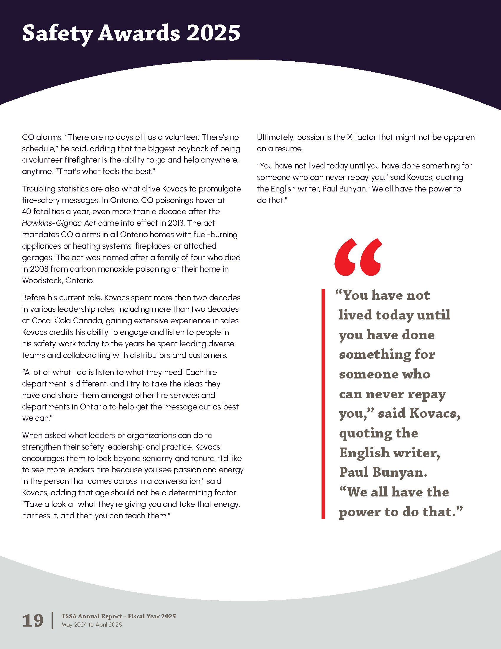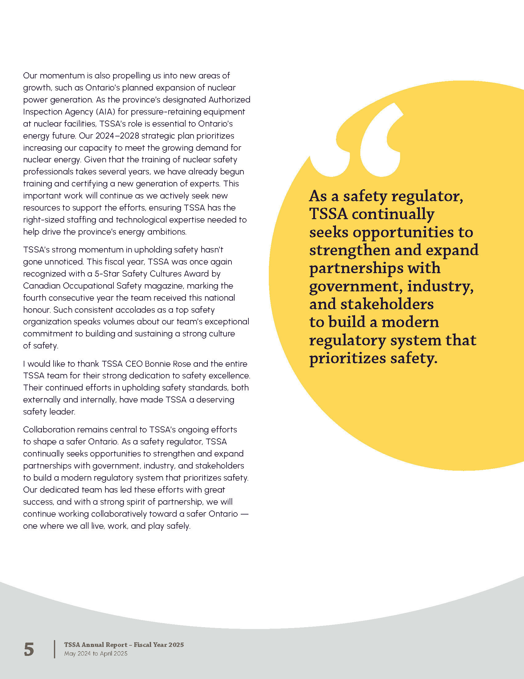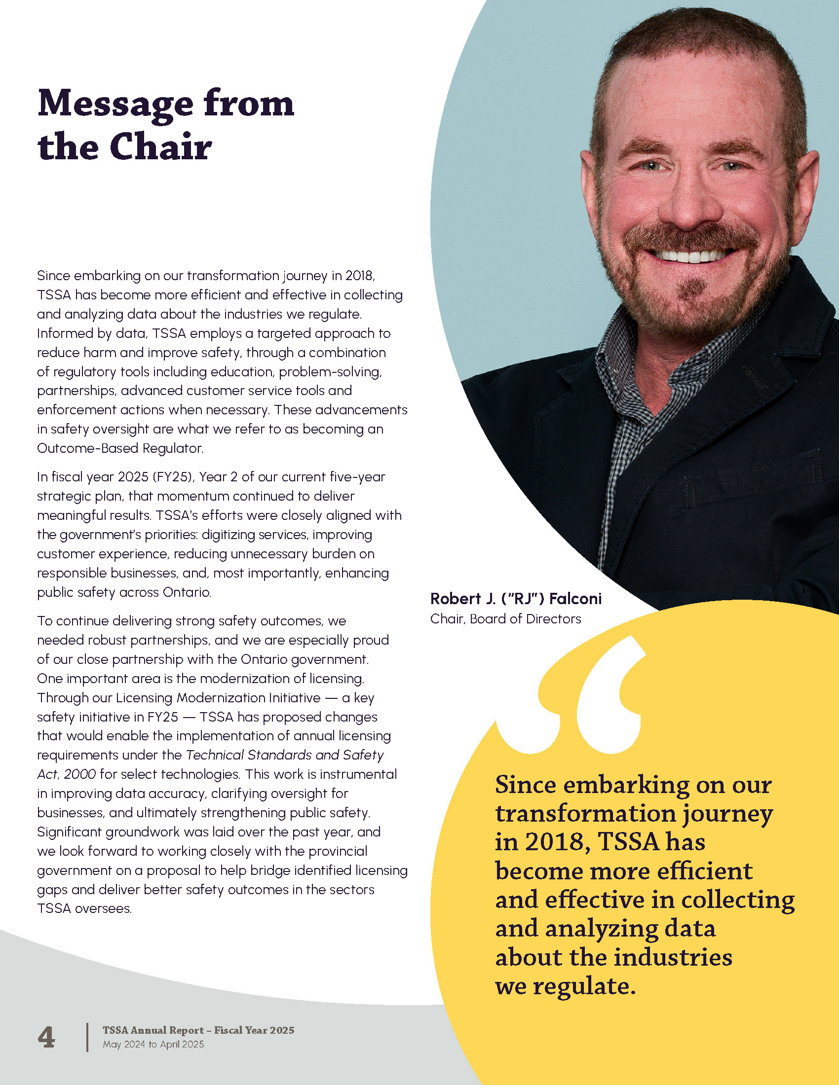 The Annual Report is published by the Technical Standards and Safety Authority in Ontario Canada. The report shares strategy and major achievements from the past fiscal year. It includes messages from leadership, program highlights, accomplishments, financial statements, and corporate policies.